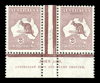 603 og/nh 38zb, zc image#38zb, zc, 2/- Maroon, two bottom margin John Ash imprint pairs from Plate 1 and Plate 2 respectively, each quite well centered and with strong color, o.g., Plate 1 pair n.h., Plate 2 pair l.h., very fine (cataloged only as blocks of four at A$1,250 each). (Image) Est. 750-1,000