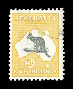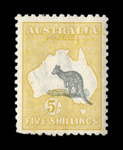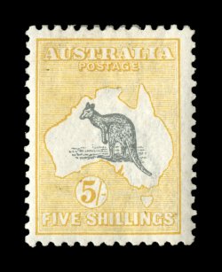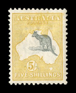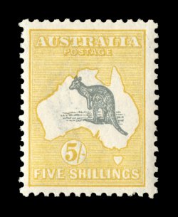 608 og 44ca image#44ca var., 5/- Grey and yellow, misplaced kangaroo, a fresh mint single showing a shift of the kangaroo vignette downward just to the top of the value circle, fresh colors, o.g., barest trace of hinging, mild horizontal bend, still very fine for this popular variety. (Image) Est. 750-1,000
