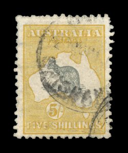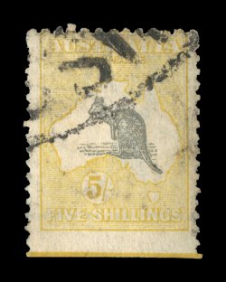 606 O 44b image#44aa, 5/- Grey and yellow, watermark sideways (crown pointing to right), the sole known example of this watermark error, fairly well centered, strong colors, slightly blurred Brisbane registered cancel, mild horizontal crease in top margin and a few nibbed perforations, all completely irrelevant given this stamp's unique status.This remarkable rarity was first recorded in 1919, soon after its issue the previous year. It is believed to be from a Harrison printing. Following its discovery, its whereabouts were unknown until it appeared at auction in Melbourne in May 1992.A once-in-a-lifetime opportunity to acquire one of the most important error rarities of not only Australia, but of the entire British Commonwealth (A$50,000). (Image) Est. 40,000-50,000