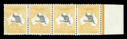 607 og 44c image#44c, 5/- Grey and yellow, doubly printed frame plate, the remarkable right sheet-margin horizontal strip of four containing the only four examples recorded of the double frame variety, with the second (albeit faint, but easily discernible) impression of the frame plate at a slight angle and 8-10mm below the first, brilliantly fresh, exceptional centering, o.g., relatively l.h., very fine and choice; this sensational strip is every bit as rare and of equal importance as the double print on the Second Watermark 5/- which catalog A$25,000 each, while this double print inexplicably only catalogs A$4,000 each (A$16,000 total), the irrelevance of its current catalog value was highlighted when this strip sold for A$34,500 (including premium) in the July 2005 sale of the marvelous Australian collection formed by Sir Gawaine Baillie (Sotheby's); 1993 BPA certificate. (Image) Est. 20,000-30,000