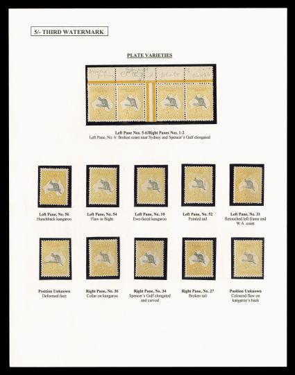 611 og/nh 44(D)d/44(V)q image#44(D)d/44(V)q, 5/- Grey and yellow, plate varieties, an extraordinary assemblage of 19 singles, one gutter strip of four and one block of four, all mint, collected for their various plate varieties of either the vignette or duty plate, virtually all different and the vast majority have been identified by plate and position, a large number being specifically listed in ACSC, all quite fresh, o.g., about a half dozen stamps are n.h., one or two with minor flaws, overall fine-very fine; a terribly difficult group to duplicate (all as hinged varieties A$9,500). (Image) Est. 4,000-5,000