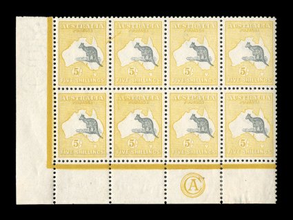 613 ogbl 44z image#44z, 5/- Grey and yellow, the magnificent bottom right corner margin CA monogram block of eight, in an incredible state of preservation and condition, marvelously bright and fresh, outstanding centering throughout, with most unusual shift of central Kangaroo vignette to right, pristine o.g., all stamps are n.h., hinged in the selvage only, with a sensible hinge reinforcement of some separated perforations at the bottom of the far right vertical row (not part of the imprint strip of three), small irrelevant selvage thin at bottom right, overall extremely fine.Any CA or JBC monogram unit of the 5/- Third Watermark issue is a major rarity. Of the CA monograms, only six are recorded, the mint block of eight offered here, a mint block of four, a mint pair and three mint singles, one of which has an inverted watermark (see next lot). This stunning mint block of eight is not only of magnificent quality, it includes the corner monogram strip of three, the configuration most desired by monogram collectors, but is almost never available, especially on any of the high value bi-colored stamps.An essential multiple for the collector seeking to assemble a world-class collection of Australian monograms and imprints (A$60,000). (Image) Est. 50,000-75,000