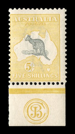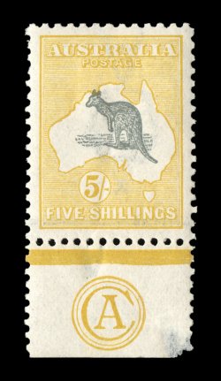 614 og 44a/za image#44a/za, 5/- Grey and yellow, watermark inverted, a highly important CA monogram single, vivid colors, exceptionally well centered, o.g., stamp lightly hinged, there are two thin spots in the bottom margin, one of which slightly rounds the bottom right corner, which is of little consequence given this stamp's great rarity, otherwise very fine; only six CA monograms are recorded on the 5/- Third Watermark issue, the block of eight offered in the previous lot, a block of four, a pair and four singles, with this example being the only one of the six recorded whose watermark is inverted; inexplicably the editors of the ACSC specifically price this CA monogram single with inverted watermark at A$15,000, while under a separate listing they price any CA monogram single at A$25,000, the disparity can only be explained by potentially factoring in the condition of this particular example, however its unique status with an inverted watermark should put it, at least, on even par with the three other known CA monogram singles (A$15,000). (Image) Est. 15,000-20,000