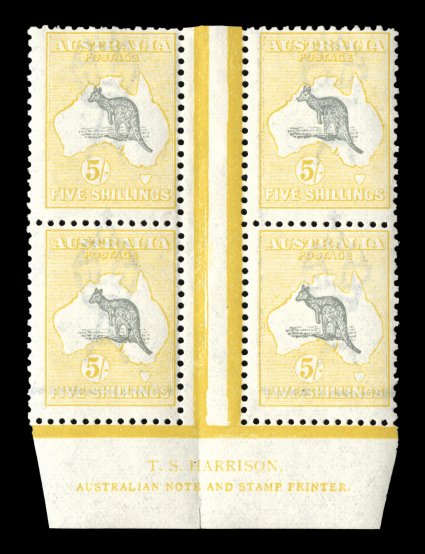 616 ogbl 44zd image#44zd, 5/- Grey and yellow, pristine bottom margin T.S. Harrison imprint block of four, bottom right stamp [R55} is the "white flaw off N.S.W. coast" variety, radiant colors, o.g., lightly hinged, usual vertical fold in gutter which ends in a small tear in the bottom margin, still fine and exceedingly rare; all Harrison imprints larger than a pair are quite rare, with only six blocks of four and one block of eight recorded (A$12,500). (Image) Est. 5,000-7,500