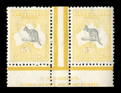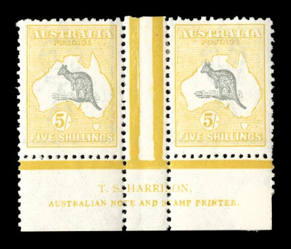 619 nh 44ze image#44ze, 5/- Grey and yellow, pristine bottom margin T.S. Harrison imprint pair, right stamp [R55] is the "white flaw off N.S.W. coast" variety, exceedingly bright and fresh, o.g., n.h., fine-very fine; not often encountered never hinged; ex-Nelson (for hinged A$2,250). (Image) Est. 1,000-1,500