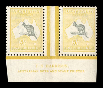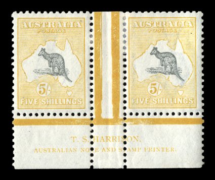 618 og 44ze image#44ze, 5/- Grey and yellow, handsome bottom margin T.S. Harrison imprint pair, right stamp [R55] is the "white flaw off N.S.W. coast" variety, unusually well centered, brilliant colors, o.g., small bit of paper adherence in bottom sheet selvage of right stamp, very fine and scarce (A$2,250). (Image) Est. 750-1,000