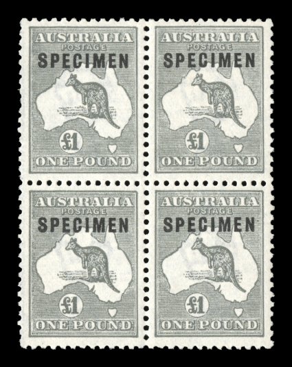 721 Sbl 53xb image#53xb, £1 Grey, "SPECIMEN" type C, C1 variant, C1a variant overprints, pristine block of four, with the left pair being type C1a variant (damaged "C"), the bottom left stamp is C1 variant (shaved "S" and defective "C"), while the right pair displays the shaved "P" variety, well centered, rich color, o.g., n.h., very fine and wonderfully choice; a very rare block of which only one block of eight and four blocks of four are recorded (for hinged A$1,250+). (Image) Est. 2,000-3,000