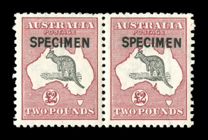 725 S 56x image#56x, £2 Black and crimson, "SPECIMEN" type B overprint, horizontal pair, well centered, deep rich colors, o.g., two corners with tiny paper h.r.'s (printer's repairing tape for an official substitution which are rare for "SPECIMEN" stamps), very fine; multiples of the type B Specimen are quite rare (for two singles A$550+). (Image) Est. 400-500