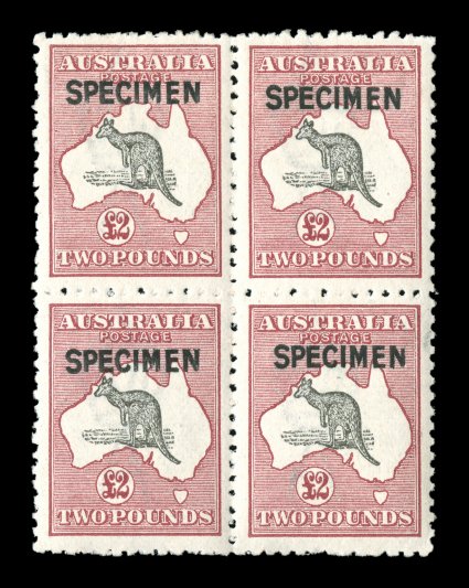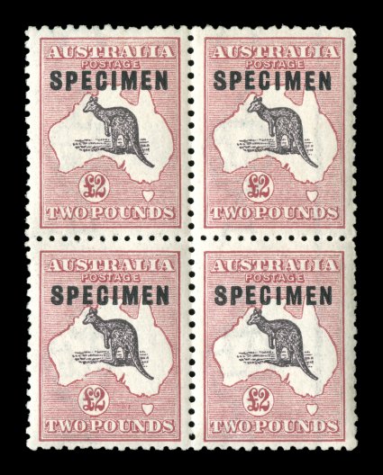 730 Sbl 56xc image#56xc, £2 Purple black and rose, "SPECIMEN" type C overprint, striking mint block of four, marvelously bright and fresh, rich colors, well centered, o.g., n.h., very fine and choice; Specimen blocks of this value are quite rare, as only four blocks of four and one block of eight are recorded with the type C overprint (for hinged A$3,000). (Image) Est. 2,000-3,000