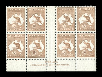 734 ogbl 22z image#22z, 6p Chestnut, choice bottom margin John Ash imprint block of eight from Plate 3 (upper), "N" over "N", with position 3L54 showing "white hairline from value circle to map" variety, extraordinarily well centered for an imprint block, deep rich color, o.g., l.h. on top stamps, lower unit n.h., some separated perforations at top of fourth vertical row (not affecting integral imprint block of four), very fine and handsome (A$350+). (Image) Est. 200-300