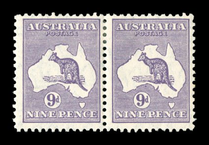 736 og 28d image#28d, 9p Violet, thin-necked kangaroo, horizontal pair, positions 3R28-29, left stamp being the distinctive plate variety with a thin neck to the kangaroo, fresh color, o.g., minor h.r., fine-very fine (A$275+). (Image) Est. 150-200