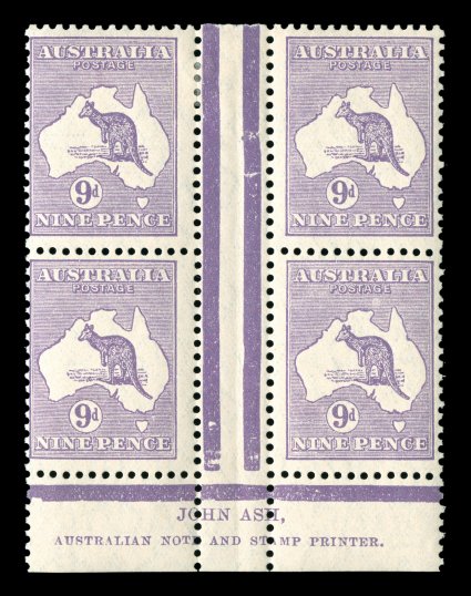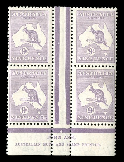 738 ogbl 28z image#28z, 9p Violet, bottom margin John Ash imprint block of four (with indent at bottom right of left-hand gutter line), from Plate 4 (lower), "N" over "N", fresh, o.g., top pair l.h., bottom pair n.h., fine-very fine (A$500). (Image) Est. 300-400