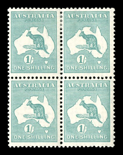 739 og/nhbl 34 image#34, 1/- Emerald, mint block of four, strong color, o.g., top pair with minor h.r., bottom pair n.h., fine-very fine; couple of expert's signatures in light pencil (including Enzo Diena), one on the bottom right n.h. single (for two hinged and two n.h. singles A$350+). (Image) Est. 150-200