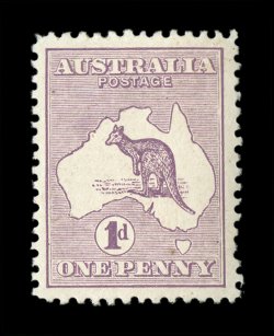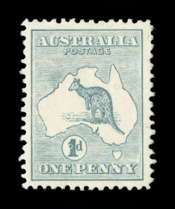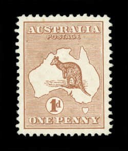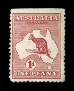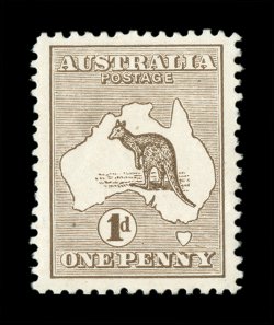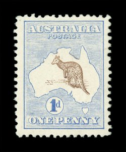 68 TC 3PP(2)K image#3PP(2)K, 1p Brown and blue, perforated 12½ plate proof in the issued color of the £1 on gummed unwatermarked paper, rather well centered, fresh colors, couple of faint thin specks of little relevance given this proof's unique status, still fine; of special note is that the kangaroo vignette has a "short" tail and a damaged foot; this dual color combination in the color of the £1 certainly holds a special distinction among these unique color trials, being that it is a bi-colored print and not a paste-up, and is the only bi-colored color trial; an extraordinary proof rarity as this is the only example known in these colors (A$30,000 - a A$10,000 premium over all the others due to its especially unique color combination). (Image) Est. 20,000-30,000