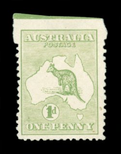 66 TC 3PP(2)I image#3PP(2)I, 1p Emerald green, perforated 12½ plate proof in the issued color of the 1/- on gummed unwatermarked paper, well centered, rich color, faint inconsequential thin spot, still very fine; an extraordinary proof rarity as this is the only example known in this color (A$20,000). (Image) Est. 15,000-20,000