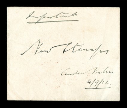73 imageOfficial final approval of the 1p Color Trial, a most remarkable historical artifact; following considerable criticism of the proposed Kangaroo designs, the Prime Minister, Andrew Fisher, called upon Postmaster General Frazer to furnish, in early September 1912, proofs of the printed stamps for his final consideration, it is believed examples of the final design, in approved base letter rate color, printed from the first 1p plate manufactured, were supplied to this request; offered here is the original envelope supplied to Andrew Fisher, which was thought to contain four examples of the 1p color trial, the envelope having been endorsed by by Fisher "Important/New Stamps/Andrew Fisher/4-9-12", envelope with handsome "Commonwealth of Australia/Prime Minister" imprint in red on reverse; this envelope and the proof which follows in the next lot together make for a matchless exhibition page. (Image) Est. 1,000-1,500