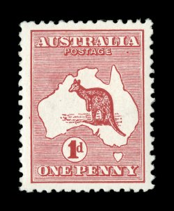 79 Pbl 3PP(1)A image#3PP(1)A, 1p Red, Die II, imperforate plate proof on thick manila paper, right sheet-margin block of six (2x3) from the right pane of Plate D, one stamp showing flaw on first "A" of "AUSTRALIA", large margins all around, bottom right stamp with natural inclusion, vertical fold in wide sheet selvage, very fine; even more elusive than the Die I examples from the same proof sheet, as there were three times as many Die I examples on the sheet of 480; ex-Nelson (ACSC A$2,000+). (Image) Est. 1,000-1,500