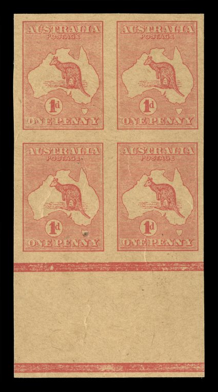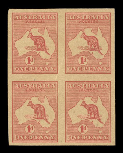 76 Pbl 2PP(1)A image#2PP(1)A, 1p Red, Die I, imperforate plate proof on thick buff manila paper, block of four, large even margins, natural paper bend/wrinkle in bottom pair, very fine and scarce; according to the ACSC, in 1964 an uncut sheet of 480 (Plates A-D) containing examples of both Die I and Die II came to light, having been subsequently broken into blocks of various sizes, the sheet had been supplied to the engineer contracted to manufacture the perforating combs (A$1,200+). (Image) Est. 400-500