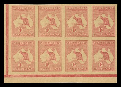 78 Pbl 2PP(1)A image#2PP(1)A, 1p red, Die I, imperforate plate proof on thick buff manila paper, handsome bottom left corner margin block of eight from the right pane of Plate B, positions 49-52/51-54, showing intersheet Jubilee lines in the sheet selvages, this being the extremely rare no monogram unit from the right pane of Plate B, large margins, typical small wrinkles, extremely fine; ex-Baillie (for two normal blocks A$2,400+). (Image) Est. 750-1,000