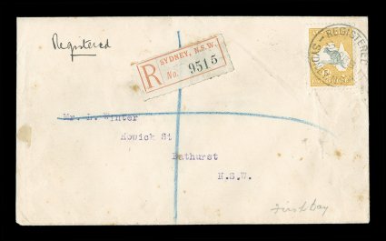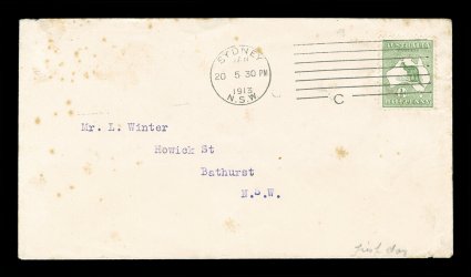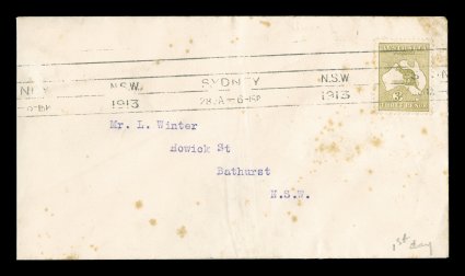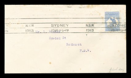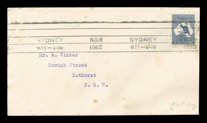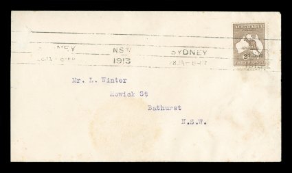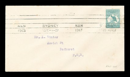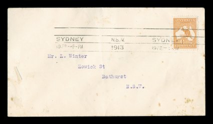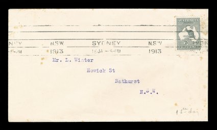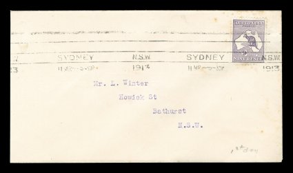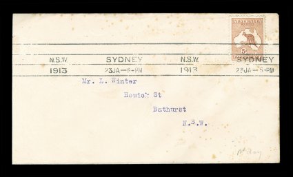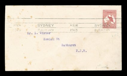 80 F 1/42 image#1/42, ½p to 5/- First Watermark issue cplt., each value tied to individual matching earliest known usage and/or first day cover by Sydney machine postmarks of various 1913 dates, each cover was serviced and addressed by Frederick Hagen, a well known Sydney stamp dealer, for a collector named Mr. L. Winter of Bathhurst, N.S.W., with the exception of the ½p and 1p (which are very early usages, but not the earliest recorded usages for these values - nevertheless are included for keeping the matching "set" intact), all of the covers represent the earliest known usage for each of the individual values, and in some cases (specifically the 2p, 2½p, 3p, 4p and 2/-) have been determined to be official first day usages and listed as such - at A$15,000 each - in the Australian Commonwealth Specialists' Catalogue, the 5/- value has been posted registered, and in addition to be the earliest known usage of this value, it is the only recorded example of the 5/- First Watermark on cover, most of the covers have foxing (toning) spots to varying degrees (which could easily be professionally removed), some have only the faintest trace of the foxing (particularly the high denomination covers), otherwise this set is quite handsome and unique.There were no official dates of issue of the various Kangaroo denominations, and stamps were dispatched from the Stamp Printer to the various States only when fresh supplies were required. In Sydney, the leading stamp dealer, Fred Hagen, kept a close watch on activities at the Sydney G.P.O., and was able to identify the dates on which the various values were first issued. All but the ½p and 1p represent the earliest dates of issue for their respective values anywhere in the Commonwealth and several have already been assigned First Day issue status in the Australian Commonwealth Specialists' Catalogue. It is anticipated with the appearance of this remarkable set of covers at auction, the editors of the ACSC will add further listings, in future editions of their catalog, of the other remaining values as either first day covers or, at the very least, earliest recorded usages. These are the only such covers in private hands, making these covers among the most famous and valuable first day covers/earliest known usages of any first issue set in the world. There is an incomplete set up to the 4p value in the Royal Collection, whose dates match those found on the covers present in this set. (imagea) (imageb) (imagec) (imaged) (imagee) (imagef) (imageg) (imageh) (imagei) (imagej) (imagek) (Image) Est. 40,000-50,000