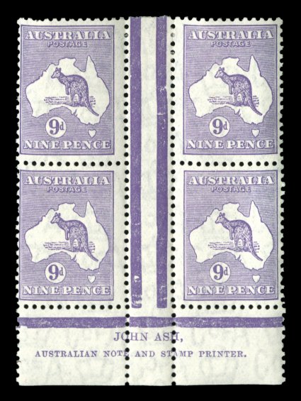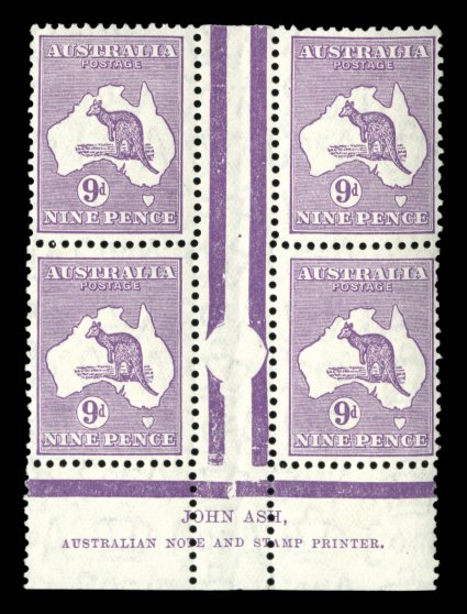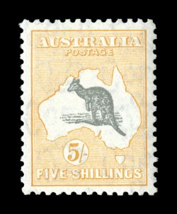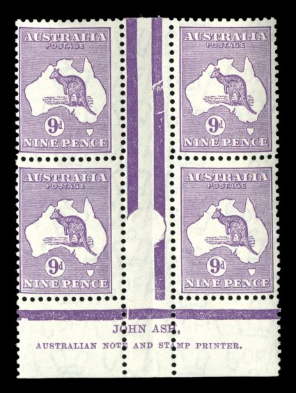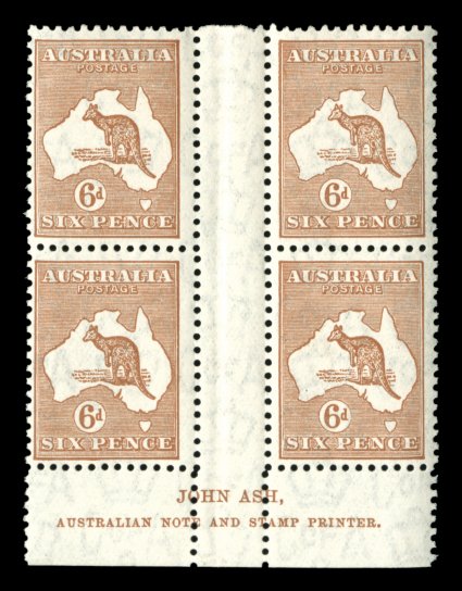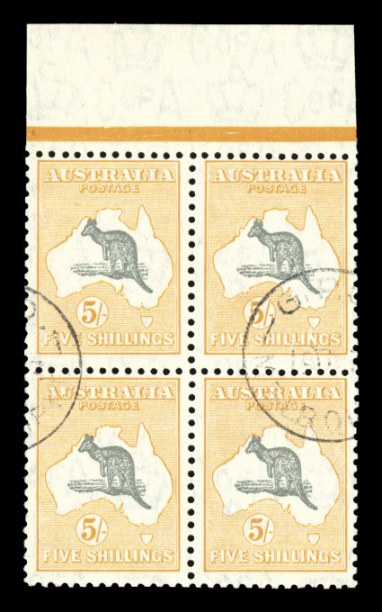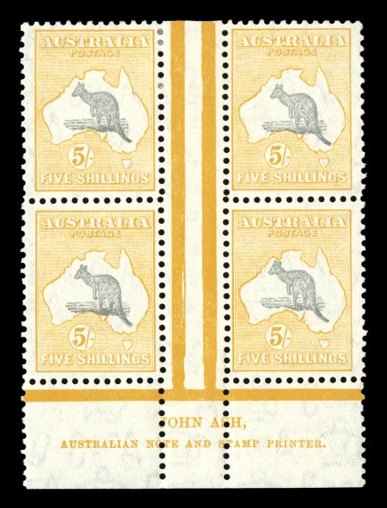 800 ogbl 46z image#46z, 5/- Grey and yellow orange, a lovely bottom margin John Ash imprint block of four, with bottom right stamp showing the "open-mouthed kangaroo" variety [R55], wonderfully well centered and brilliantly fresh, vivid colors, o.g., l.h. (tiny h.r. on a couple of perforations), very fine; an especially scarce and desirable imprint block in this exceptional quality (A$2,750). (Image) Est. 1,500-2,000