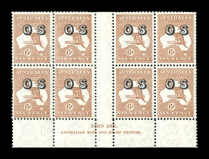 783 ogbl 23(OS)z image#23(OS)z, 6p Chestnut, overprinted "OS", handsome bottom margin John Ash imprint block of eight from Plate 3 (upper), "N" over "N", with position 3L54 showing the "white hairline from value circle to map" variety, well centered, deep luxuriant color, o.g., barely hinged at top center (virtually confined just to the gutter), mostly n.h., very fine; ex-Nelson (A$450+). (Image) Est. 200-300
