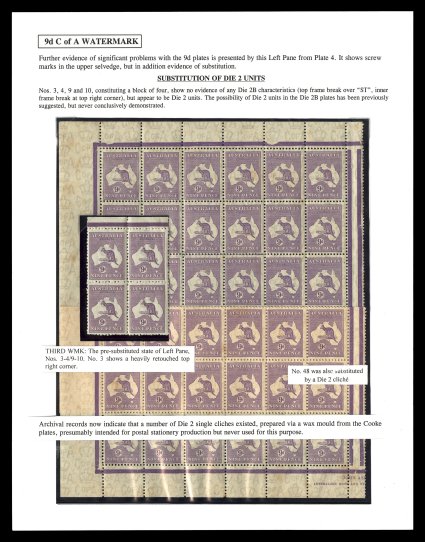 785 nhbl 29f, g, ha, i, ja image#29f, g, ha, i, ja, 9p Violet, Die II substitution for Die IIB units, a remarkable complete left pane of 60 from Plate 4, which shows conclusively that indeed Die II cliches were substituted within the sheet (normally Die IIB) in positions 3, 4, 9, 10 and 48, none of these positions show the top frame break over "ST" of "AUSTRALIA" characteristic of Die IIB stamps, clearly being Die II substitutions previously suggested but not proven until demonstrated by this sheet, rich color, o.g. which is just slightly aged toned in a few spots (not seen on face), n.h., light horizontal crease in third row, sheet neatly and carefully folded along a couple of horizontal rows for ease of exhibition, overall fine; an important and rare sheet for the kangaroo specialist (for the five hinged se-tenant Die II/Die IIB pairs and 52 never hinged Die IIB stamps A$6,700+). (Image) Est. 3,000-4,000