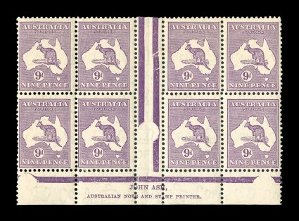 787 nhbl 29za image#29za, 9p Violet, bottom margin John Ash imprint block of eight, second state from Plate 3, "N" over "N", with screw inserted in gutter and marginal rule broken away, fresh and intact, nicely centered, deep rich color, o.g., n.h., very fine (for hinged imprint block of four and four n.h. singles A$675+). (Image) Est. 400-500