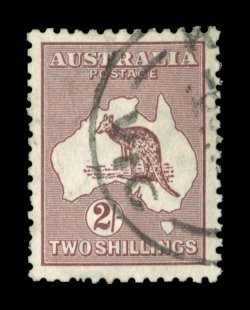 792 O 41a image#41a, 2/- Maroon, redrawn die, watermark inverted, used, wonderfully well centered within large margins, deep rich color, neat portion of Kooyong, Vic. c.d.s., single nibbed perforation at bottom, very fine; an immensely rare stamp as only four examples, all used, are recorded, and this example is probably the finest of the four, an important rarity of Australia and of the entire British Commonwealth (A$20,000). (Image) Est. 10,000-15,000