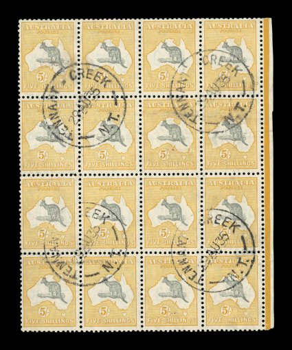 795 Obl 46 image#46, 5/- Grey and yellow orange, two striking used blocks of sixteen (4 x 4) and eight (4 x 2) that together once formed an extraordinary used block of 24, (£6 postage in total, almost certainly from a gold bullion package), both with right sheet margins, intensely rich color, well centered, with a total of six neat strikes of "Tennant Creek, N.T./29 AU 35" c.d.s. postmarks, couple of stamps (at left) of block of sixteen with flaws, otherwise very fine; a perfect pair of multiples for an exhibition page (for 24 used singles A$600+). (Image) Est. 400-500