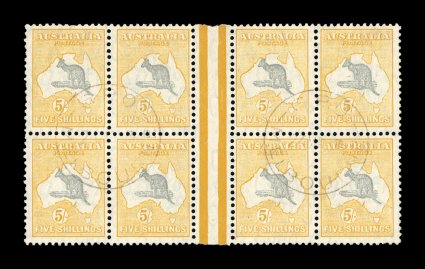 797 Obl 46w image#46w, 5/- Grey and yellow orange, handsome vertical gutter block of eight, with central large size G.P.O. Melbourne c.t.o. datestamps on each block, rich luxuriant colors, well centered, two left stamps with corner perf. tip creases, overall very fine (for c.t.o. singles A$280+). (Image) Est. 150-200