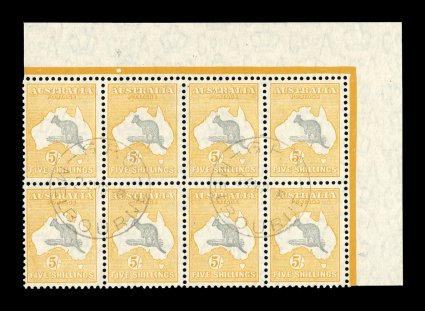 798 Obl 46w image#46w, 5/- Grey and yellow orange, select top right corner margin block of eight, positions R3-6/9-12, with two central strikes of large size G.P.O. Melbourne c.t.o. datestamps, position R12 being the "two breaks in N.S.W. coast" variety (#46(D)i), well centered, rich colors, very fine (for c.t.o. singles A$280+). (Image) Est. 150-200