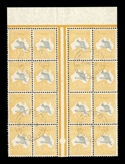 799 Obl 46w image#46w, 5/- Grey and yellow orange, impressive top margin vertical gutter block of sixteen, positions left pane #5-6/23-24 and right pane #1-2/19-20, position L6 showing the "broken coast near Sydney and Spencer's Gulf elongated" variety (#46(D)f), four neat strikes of large G.P.O. Melbourne c.t.o. datestamps, well centered, rich luxuriant colors, very fine and striking (for c.t.o. singles A$560+). (Image) Est. 300-400