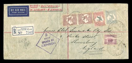 822 c 58 image#58, £2 Grey and rose crimson, fine single, along with a vertical pair of the 2/- and a single £1 from the same series, plus a 5p Sheep, all tied to a registered airmail cover from Abel, Lemon & Co., Sydney to Shrewsbury, England, stamps tied by light strikes of "G.P.O. Sydney/7 OC 40/NSW-AUST" c.d.s. postmarks, transit postmarks on reverse, violet boxed "Not Opened by Censor" handstamp, red manuscript endorsement "by air - Australia/N. Zealand - U. Kingdom", some negligible usage wrinkling and vertical file fold not affecting stamps, fine; the entire franking represents the eleven times rate for a clipper letter (11 x 5/10p, weighing 5 to 5 ½ ounces) between Australia and the United Kingdom, plus 3p registration fee; an amazing commercial usage of the £2 value on an envelope, versus the more "commonly" seen usage on a parcel tag, in fact this is one of only two recorded usages on an envelope and is widely recognized as one of the most important Kangaroo covers in existence (A$10,000). (Image) Est. 7,500-10,000