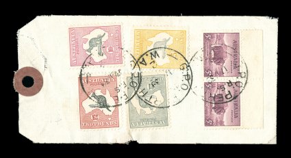 823 c 58 image#58 £2 Grey and rose crimson, fine single, along with 5/-, 10/- and £1 from the same series (as well as a pair of the 5p Sheep), all tied to a registered gold bullion tag from Perth to the United States of America mint in San Francisco, stamps tied by "G.P.O./Perth/WA" 1939 postmarks, some usage wrinkling and vertical crease to tag not affecting stamps, fine; a marvelous and rare franking of a complete "set" of high values one one tag (for £2 alone on tag A$1,500). (Image) Est. 750-1,000