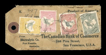824 c 58 image#58, £2 Grey and rose crimson, fine single, along with 5/-, 10/- and £1 from the same series, all tied to a parcel tag for an ore sample sent from The Electrolytic Refining and Smelting Company at Wollongong (N.S.W.) to the Canadian Bank of Commerce in San Francisco on June 30, 1937, cancels a bit indistinct, tag with usage soling and wear; most unusual to see the franking on the address side of the tag, which also shows declared weight of "464 ozs" of gold! (for £2 alone on tag A$1,500). (Image) Est. 500-750
