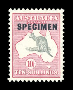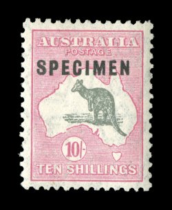 826 S 50x image#50x, 10/- Grey and pink, "SPECIMEN" type C overprint, choice example showing the "ewe-faced kangaroo" variety [L10], flawless centering, bright colors, o.g., l.h., extremely fine (A$400+). (Image) Est. 200-300