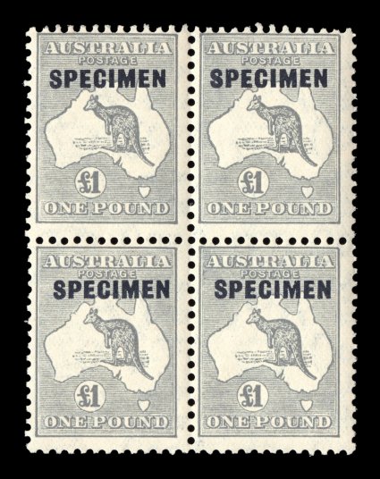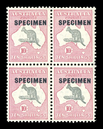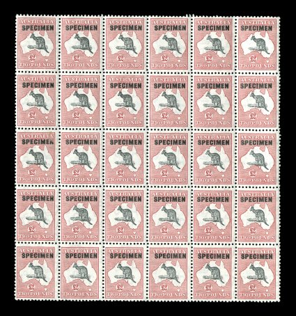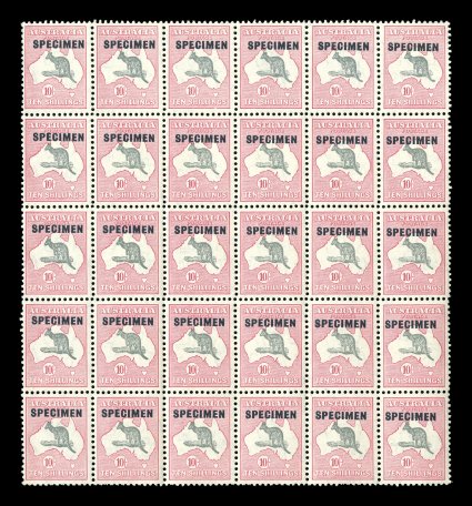830 Sbl 50xg image#50xg, 10/- Grey and pink, "SPECIMEN" type D overprint, complete forme of 30, impressive block of 30 comprising the complete forme, being from the upper right pane, three stamps showing major plate varieties (R12 very short Spencer's Gulf, R16 white flaw before "POSTAGE" and R20 rat-faced kangaroo), exceptionally well centered, fresh colors, o.g., a few stamps at edges l.h., mostly n.h., very fine and rare; only five intact formes of 30 are recorded; ex-Chapman (A$4,000). (Image) Est. 2,000-3,000