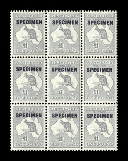 833 Sbl 54xa image#54xa, £1 Grey, "SPECIMEN" type D overprint, choice block of nine, exceptionally bright and fresh, well centered, strong color, o.g., n.h., very fine; the largest recorded block apart from the few known complete formes (for hinged block of four and five singles A$600+). (Image) Est. 300-400