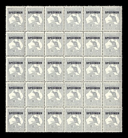 834 Sbl 54xb image#54xb, £1 Grey, "SPECIMEN" type D overprint, complete forme of 30, impressive block of 30 comprising the complete forme, being from the upper left pane, one stamp [L28] showing the "break in coast of S.E. Australia" variety, well centered, fresh color, o.g., a few stamps at top and bottom faintly hinged, mostly n.h., very fine and rare; only five intact formes of 30 are recorded; ex-Chapman, Australia Post archives (A$4,500). (Image) Est. 2,000-3,000
