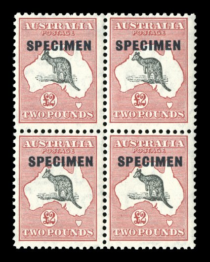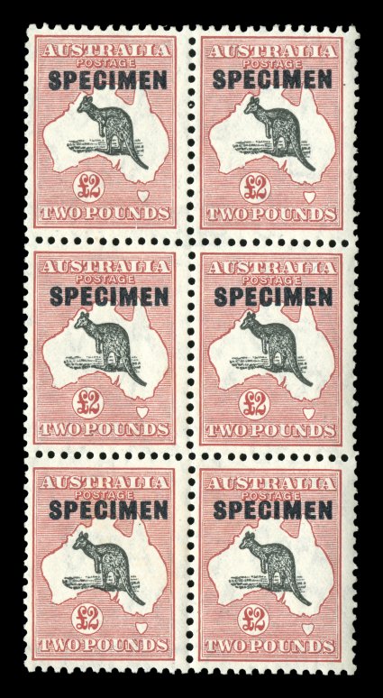 837 Sbl 58xa image#58xa, £2 Grey and rose crimson, "SPECIMEN" type D overprint, pristine block of six (2 x 3), positions R1-2/7-8/13-14, with two identified plate varieties within the block, "break in lower frame under the 'N' of 'POUNDS'" [R1], and "broken coast in Bight" [R3], rich colors, o.g., n.h., nearly very fine (for hinged block and two n.h. singles A$1,000+). (Image) Est. 400-500