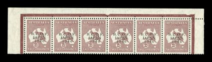 839 og/nh J1-7a imageS.G. #J1-7a, 2/- Maroon kangaroo, overprinted "B.C.O.F. Japan 1946", handsome top sheet margin horizontal strip of six, incredibly well centered, o.g., stamps n.h. (hinged in the selvage only), lightly folded along center vertical row, extremely fine; also includes single examples of all other values from the set, including the two different papers of the 5/-, o.g., l.h. or n.h. (S.G. catalog £475). (Image) Est. 300-400