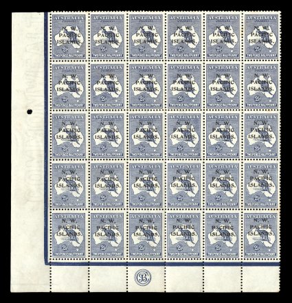 840 ogbl 74 imageS.G. #74, 2½p Indigo kangaroo, overprinted "N.W. Pacific Islands.", types a, b and c, a very rare complete pane of 30 from the bottom left corner of the sheet, from a initial first printing with complete sheet margins at left and bottom, incorporating a seldom seen JBC monogram at bottom left, later printings and all other stamps (except the first printings of the 1p George V as well) overprinted for use in N.W.P.I. had the panes overprinted without any sheet selvage, therefore this is the only kangaroo monogram unit from N.W.P.I. available, well centered, deep rich color, o.g., a few stamps at top and in sheet selvage with minor h.r.'s, most n.h., very faint gum toning on a few stamps, very fine; a key kangaroo monogram item that is almost never encountered. (Image) Est. 2,000-3,000