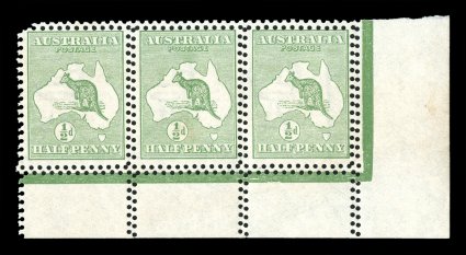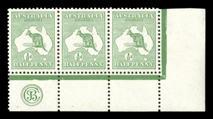 92 nh 1a/zb image#1a/zb, ½p Green, watermark inverted, bottom right corner JBC monogram strip of three, marvelously well centered, bright and fresh, o.g., stamps n.h., minor h.r. in right sheet selvage only, couple of separated perfs. at top between second and third stamps, very fine and exceedingly choice; monogram pieces with watermarks inverted are extremely rare, in fact, this is the only JBC monogram piece recorded (A$2,500). (Image) Est. 2,000-3,000