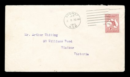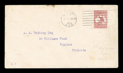 81 F 2y image#2y, 1p Red, Die I, fresh single tied to rare First Day Cover by unusually clear "Sydney, N.S.W./JAN 2 1913/5:30 PM" machine cancel, cover prepared by prominent Sydney stamp dealer Frederick Hagen and addressed to a Mr. Arthur Whiting in Windsor, Victoria, cover is also quite fresh and clean, with only minor wrinkling at left, very fine and choice; among the finest quality examples of this First day Cover available, as most are found with indistinct cancels and/or with cover faults; approximately eleven First day Covers recorded, two of which are in the Australia Post archival collection and one in the Royal Collection (A$12,500). (Image) Est. 7,500-10,000