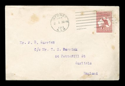 82 F 2y image#2y, 1p Red, Die I, single tied to rare First Day Cover by uncommonly clear "Sydney, N.S.W./JAN 2 1913/5:30 PM" machine cancel, cover prepared by prominent Sydney stamp dealer Frederick Hagen and addressed to a Mr. F.R. Carrick in Carlisle, England (paying the 1p British Empire rate), manuscript "Issued Jan 2nd 1913" on reverse, cover bit reduced at left and with minor tone spots, fine; approximately eleven First day Covers recorded, two of which are in the Australia Post archival collection and one in the Royal Collection (A$12,500). (Image) Est. 4,000-5,000