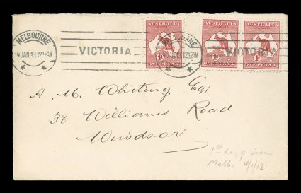 84 F 2y image#2y, 1p Red, Die I, single and a horizontal pair, tied to neat and clean cover self-addressed to well known collector A. M. Whiting in Windsor, Victoria by clear "Melbourne/4.JAN.13" machine cancel, this being the first day of issue in Melbourne, very fine; one of only three such Melbourne first day of issue covers known; all the recorded Melbourne first day usages were prepared by Mr. Whiting, who also received a number of the January 2, 1913 Sydney covers prepared by Frederick Hagen. (Image) Est. 200-300