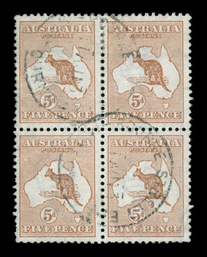 86 Obl 1/30 image#1/30, ½p to 1/- First Watermark issues cplt. in postally used blocks of four (the 1p in a used block of 18), all commercially used with various cancels, fresh colors, as would be expected there are some blocks with minor usage flaws or separated perforations, overall a fine-very fine and difficult group to assemble (for used singles A$838+). (Image) Est. 300-400