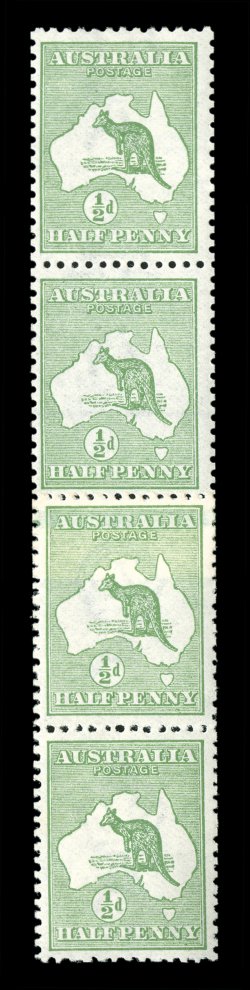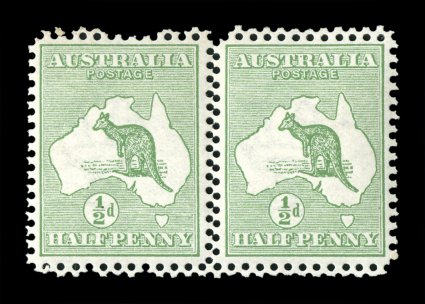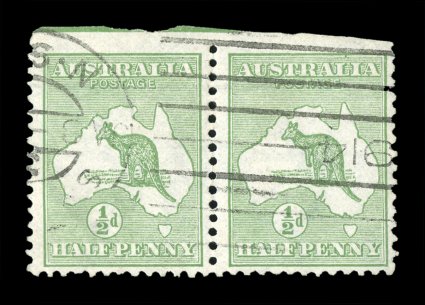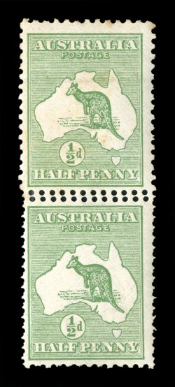 98 og 1bb image#1bb, ½p Green, double perforations, vertical pair with bottom stamp displaying double perforations on three sides (normal at bottom), o.g., light toning mainly visible on the reverse, very fine (A$400+). (Image) Est. 150-200