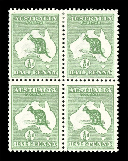 90 og/nhbl 1a image#1a, ½p Green, watermark inverted, fresh mint block of four, nicely centered, bright color, o.g., top pair with minor h.r., bottom pair n.h., very fine (for hinged A$400+). (Image) Est. 200-300